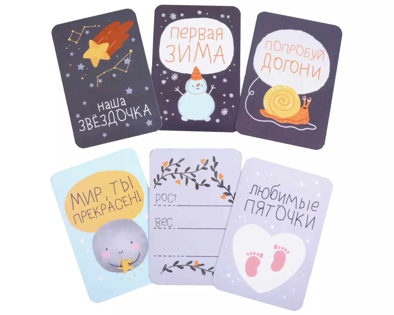 В наборе 36 двустронних карточек для фотосессии лаконичного дизайна, выполненных из плотного картона, размером 10х15 см. Вас ждут 60 идей для фото + 12 карточек для заметок о росте, о весе и достижениях малыша. Набор универсальный, подойдет как мальчику, так и девочке. Края карточек скруглены для безопасности крохи.