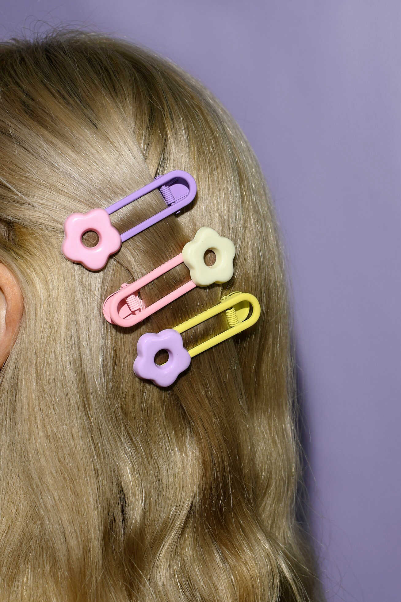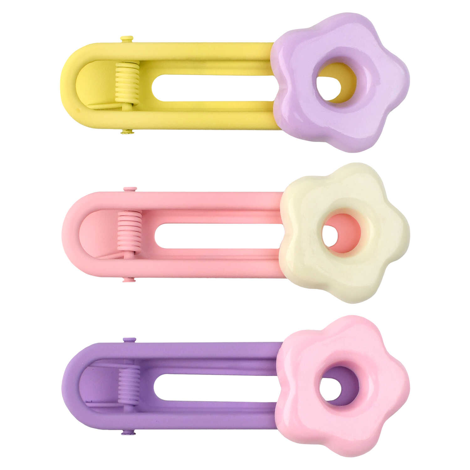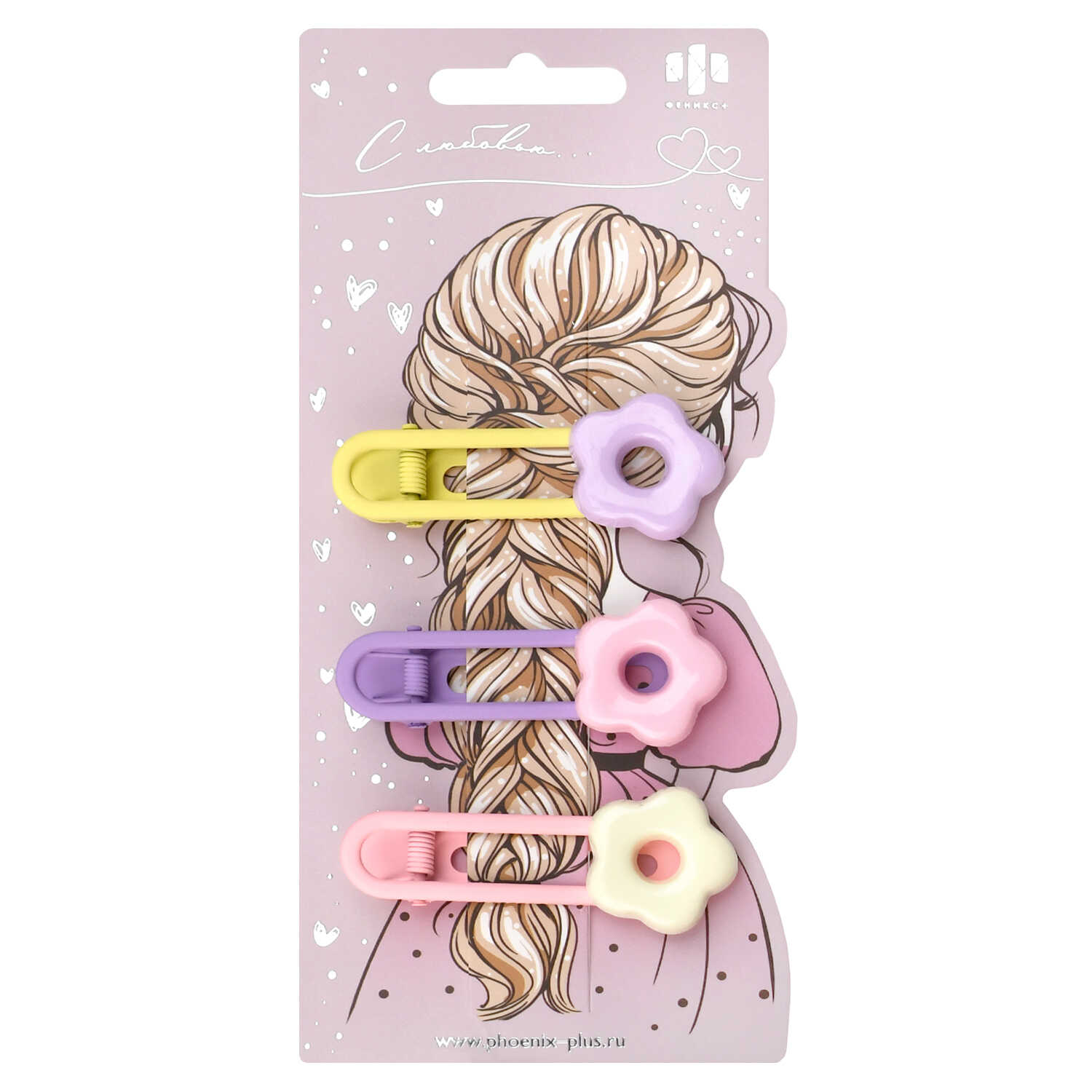 Набор заколок для волос «зажим», арт. 71790 / 10 ЦВЕТОЧКИ (в наборе: 3шт., 6,2 см, черный металл, полиэфирная смола, цвет: жёлтый, розовый, сиреневый, подложка из мелованного картона + ПЭТ-пакет с европодвесом)