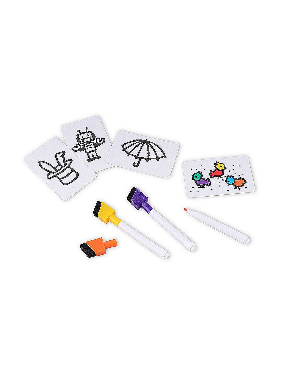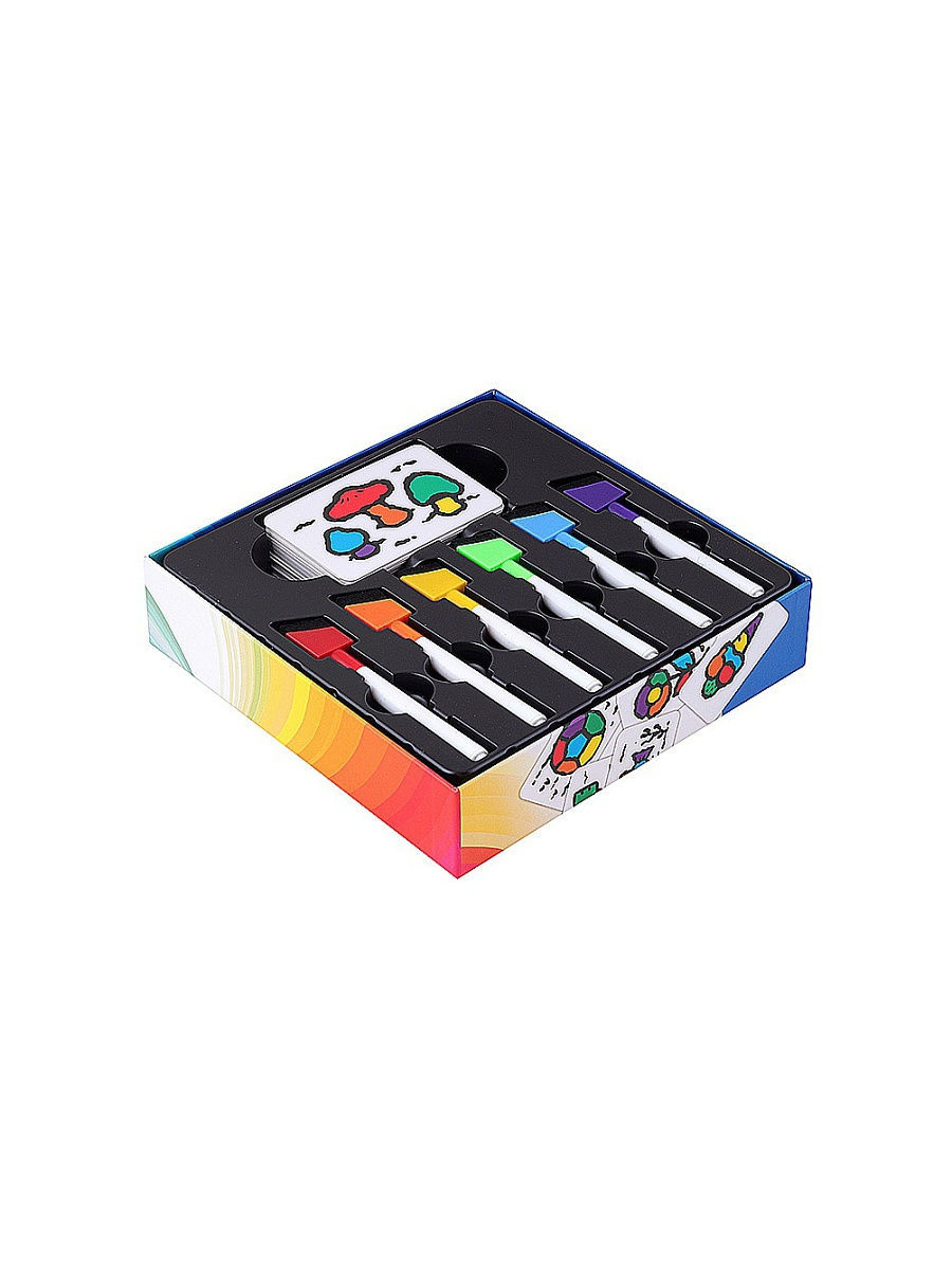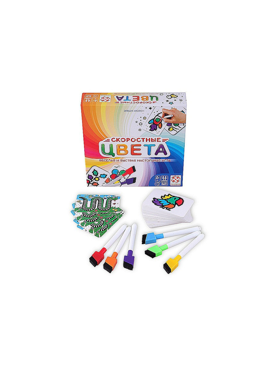 В комплект настольной игры "Скоростные цвета" входят: 55 карт с картинками, 5 двусторонних карт для подсчёта очков, 6 маркеров со стирающими колпачками, сумочка-игровое поле.