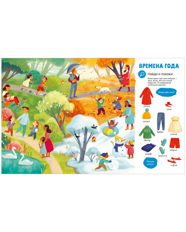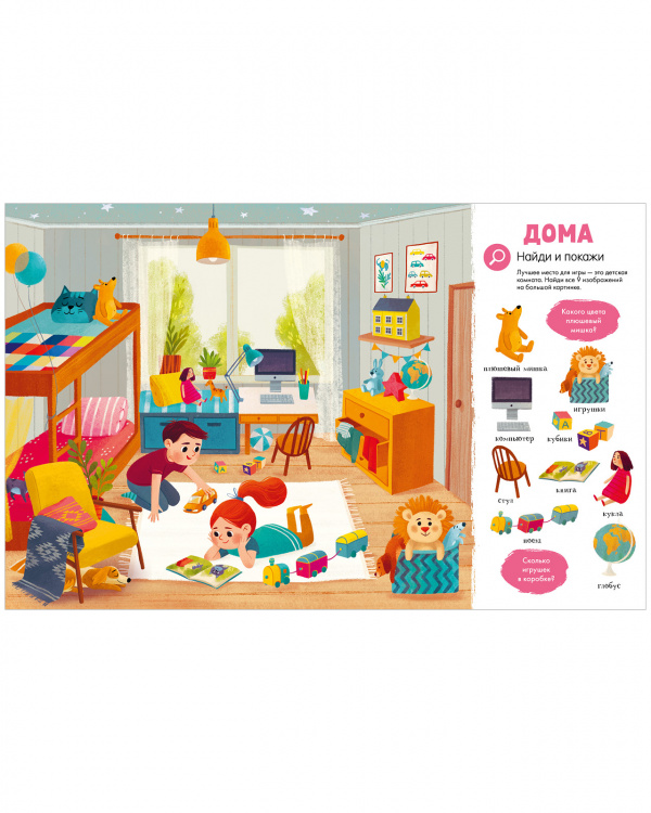 Вам предстоят увлекательные задания: найти все съедобные предметы красного цвета, обнаружить все оттенки зеленого, сосчитать на картинке всех детей в шлемах и многое другое. Удобный для маленьких ручек формат и неубиваемый твердый переплет сделают книгу одной из любимых на долгое время.
