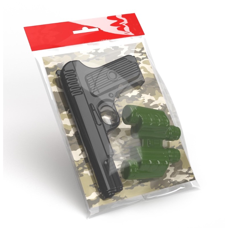 Пистолет и бинокль. Выдувка. Материал: пластмасса. Состав: пистолет чёрный (15,5 х 10,5 см), бинокль зелёный (7,8 х 6,5 см). Лёгкие по весу. Имеют углубления и выступы декоративного характера, гладкие по всей поверхности, не содержат механизмов, что делает игру безопасной и комфортной. Игра с игрушечным пистолетом и биноклем развивает подвижность, мелкую моторику, меткость, внимательность.