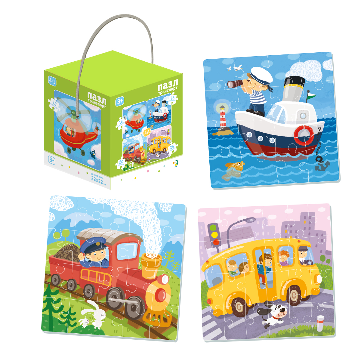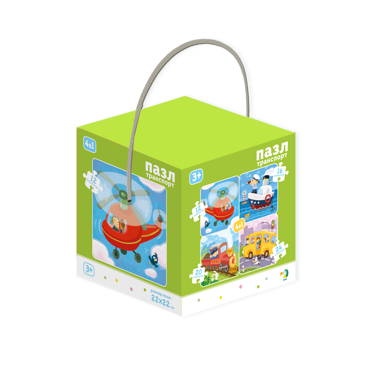 Пазл 4в1 «Транспорт» представляет собой сразу четыре отдельные картинки, которые необходимо аккуратно собрать, соединив детали. Малыш крупным планом увидит вертолет, корабль, поезд, автобус, познакомиться с их отличительными особенностями, строением, предназначением. Все иллюстрации имеют одинаковый размер, но состоят из разного количества пазлов: 12, 16, 20 и 24 элементов. Размер собранного пазла: 22*22 см.