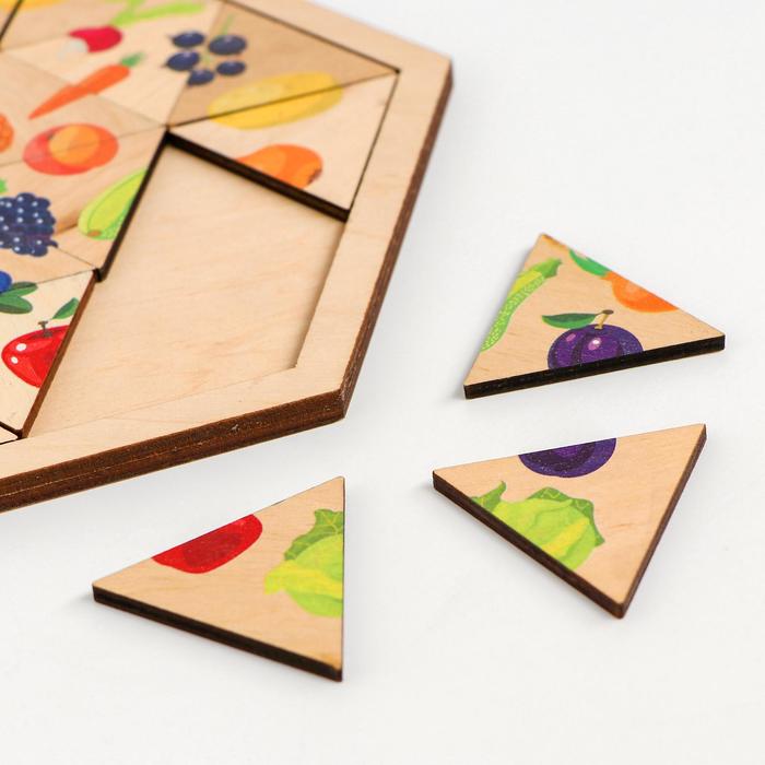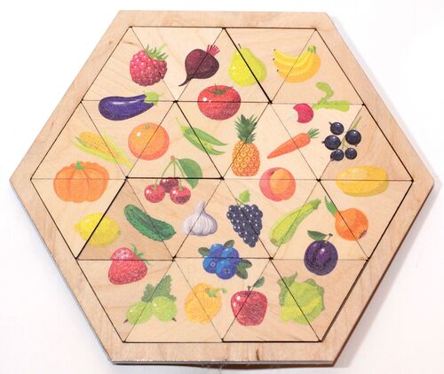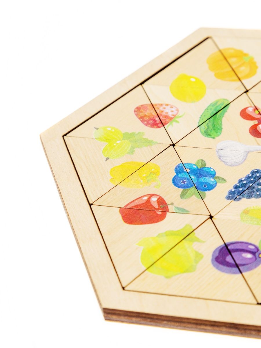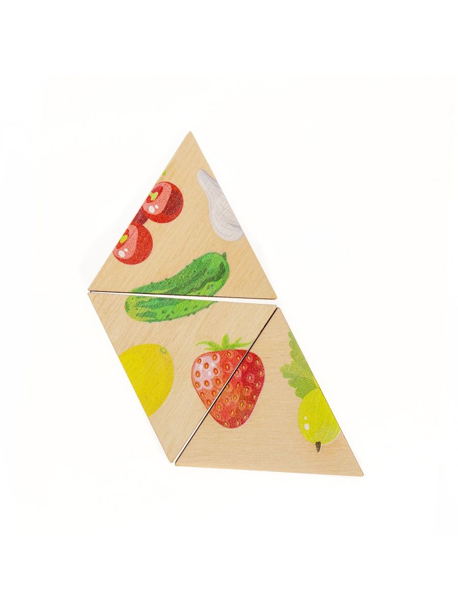 Пазл представляет собой игровой планшет, изготовленный из берёзовой фанеры и тщательно отшлифованный, который имеет углубление для фишек. Малышу необходимо расставить треугольные пазлы так, чтобы все 30 картинок ягод, овощей и фруктов были восстановлены. На каждой фишке – только фрагмент картинки, поэтому придётся хорошенько постараться, чтобы части всех 30 картинок совпали.