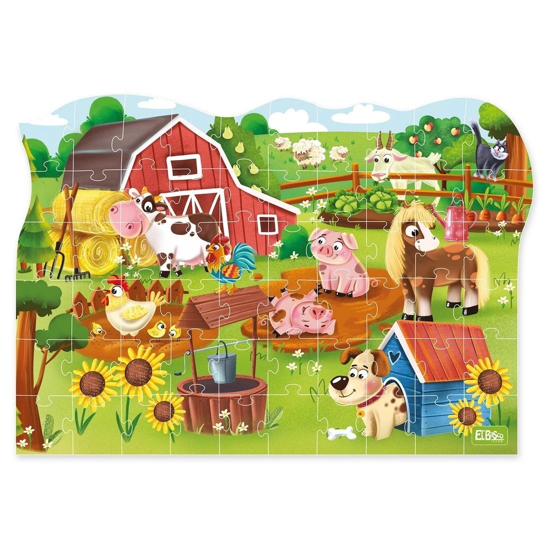 На ферме всегда есть чем заняться! Вот и наши герои не отстают – козлик щипает капусту, кот исследует свою территорию, поросята резвятся в лужице грязи, а щенок отважно сторожит свою косточку. Интересный и яркий пазл станет самым занимательным детским увлечением. В процессе собирания пазлов у малыша будут развиваться зрительное восприятие, логическое мышление, внимательность, усидчивость, мелкая моторика рук. Пазл серии «Животные» выполнены из легкого, но в то же время прочного и износоустойчивого картона. Каждый пазл серии состоит из 60 элементов. Размер собранного пазла 32*23 см. Особенностью данного пазла является его необычная форма, а также то, что все пазлы серии можно собрать в один большой, присоединив каждый собранный пазл друг к другу!