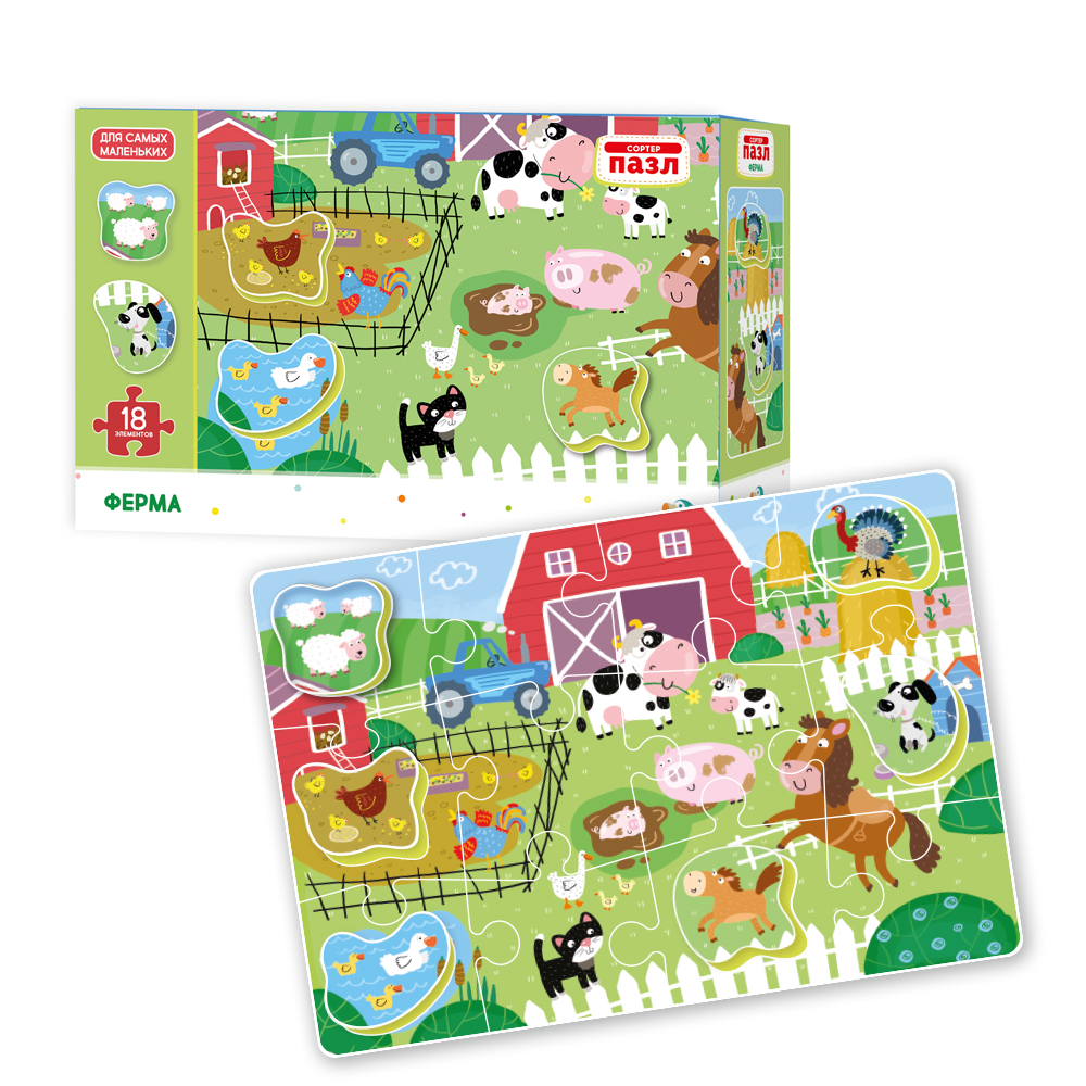 Пазл-сортер "Ферма" в собранном виде представляет собой иллюстрацию размером 31x45 см. На ней изображена красочная ферма в летний период, с постройками и домашними животными. Среди них ребенок узнает кур, уток, лошадей, свиней, коров, овец, индюка, кота и собаку. Чтобы составить картину, малышу необходимо правильно соединить 18 крупных деталей.