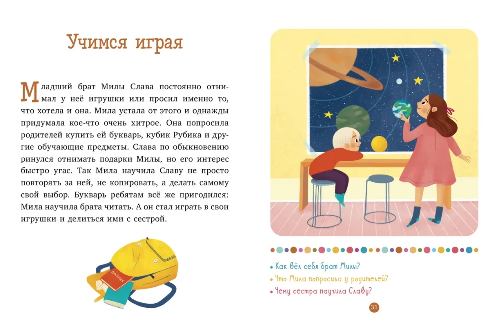 «Вместе веселее. 31 история» — это сборник добрых семейных сказок. Благодаря героям книги ваш малыш научится справляться с новыми эмоциями и заботиться о близких. Рита боялась темноты и не признавалась маме в своих страхах, но когда призналась, мама сразу же помогла, и Рита поняла, что с близкими можно и нужно делиться! Варя волновалась, что с появлением младшего братика родители перестанут любить ее, но оказалось, что теперь ее будут любить не только мама с папой, но еще и брат! Даша с Юлей никак не могли поделить плюшевого мишку, Денис завидовал своему брату, Гриша не желал делиться конфетами... Каждая история — это ситуация, в которую может попасть любой ребенок. Обязательно обсудите с малышом героев и сюжет. В конце рассказов вы найдете вопросы, которые помогут вам сделать это. Истории в этой книге короткие — на страничку, текст простой и понятный, шрифт крупный, а еще много картинок. Сборник «Вместе веселее. 31 история» идеально подойдет дошкольникам и школьникам для первого самостоятельного чтения. 31 короткая история на важную тему научит понимать свои чувства и чувства других, справляться со своими эмоциями и уважать друзей и близких. Лида Данилова — постоянный автор издательства Clever, ее простые истории о важном любят тысячи мам и малышей.