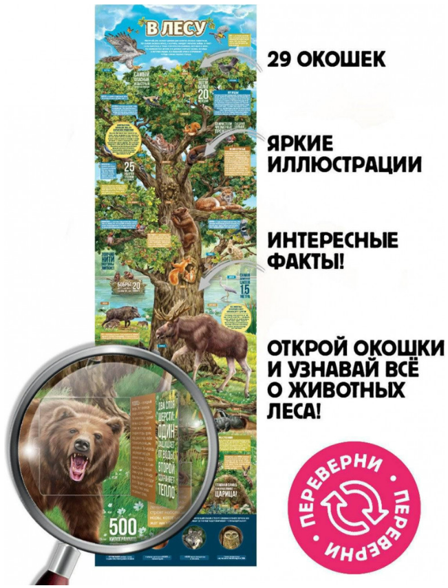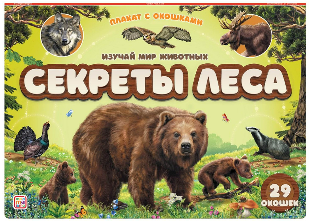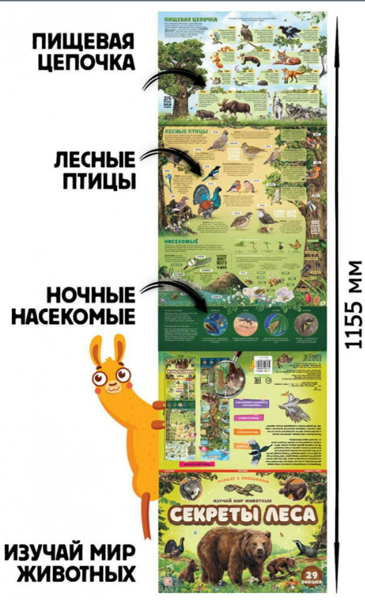 Серия «Плакат с окошками» от торговой марки Malamalama — это серия новых удобных и наглядных пособий для развития ребёнка. Это книжка-трансформер, которая развернётся в плакат и станет отличным дополнением учебного уголка. Красочные иллюстрации дополняют процесс изучения и способствуют запоминанию информации, а окошки подогревают интерес. Плакат с окошками "Секреты леса"- плакат про животных. Формат в сложенном виде: 325х230 мм. Формат в разложенном виде: 325х1155 мм.