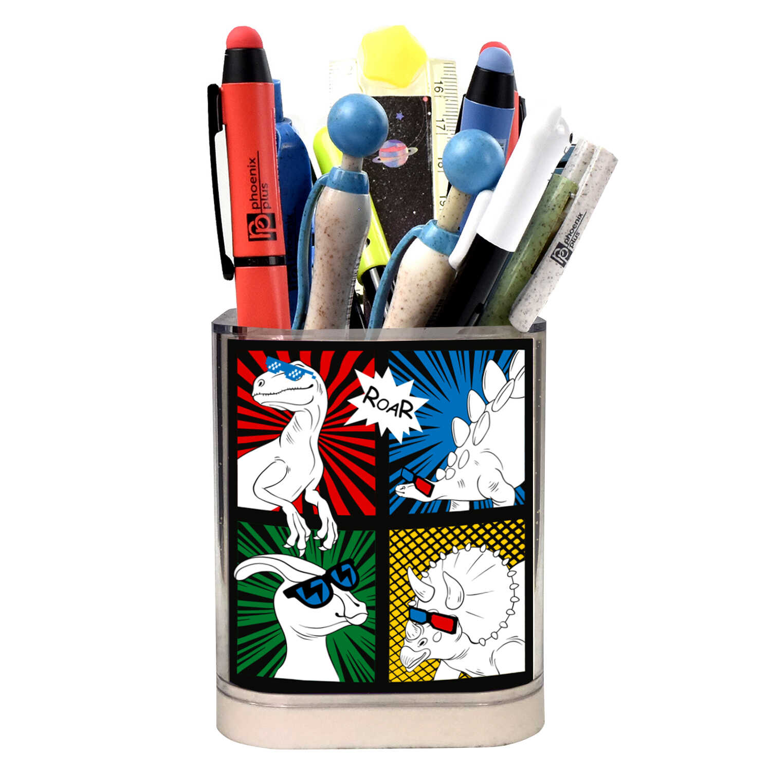 Подставка для канцелярских принадлежностей, арт.62677/ 24 ДИНО-КОМИКС (8,2х10,3х8,2 см, полистирол, цвет: голубой, жёлтый, зеленый, красный, черный, полноцветная печать, 1 отделение (-ия), ПЭТ-пакет).