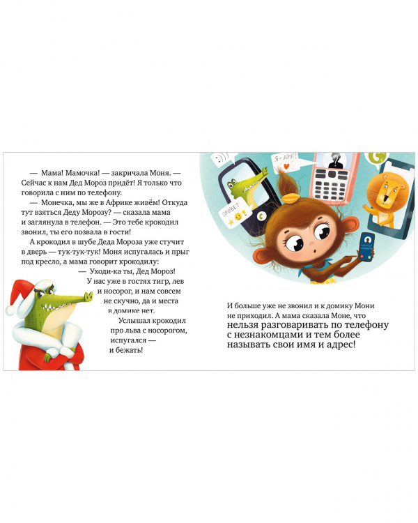 Как и многие малыши, обезьянка Моня иногда играет с родительским смартфоном. Но что делать, если звонят с чужого номера, а взрослых рядом нет? Стоит ли разговаривать с незнакомцем, даже если он представляется Дедом Морозом? И как не допустить, чтобы смартфон украл целый день?
