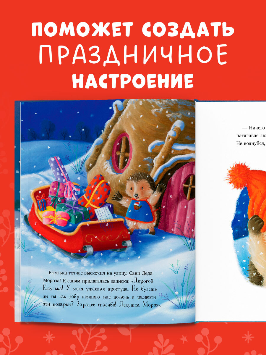 Скоро наступит Новый год, а Дедушка Мороз заболел и не может развозить подарки. Конечно, Ежулька соглашается помочь и отправляется в путь. Это так приятно и ответственно — быть помощником самого Деда Мороза! Вот только в волшебных санях оказалось так много подарков для всех лесных жителей, что маленькому ежику никак не справиться одному… Заяц, Лиса, Барсук и мышата поспешили на помощь! Успеют ли пушистые друзья доставить все подарки на Новый год?
