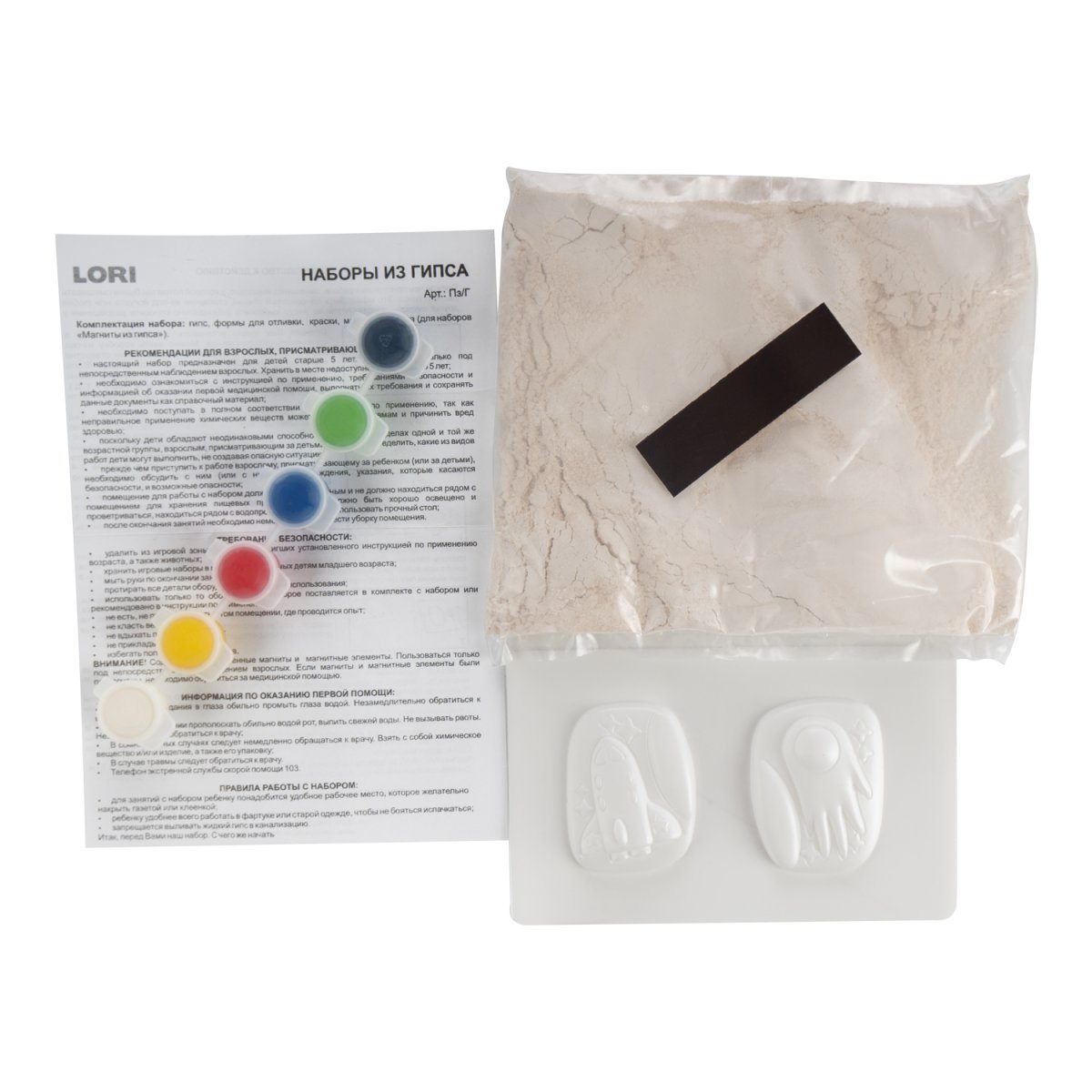 Формы, гипс, краски, магнитная лента, инструкция.