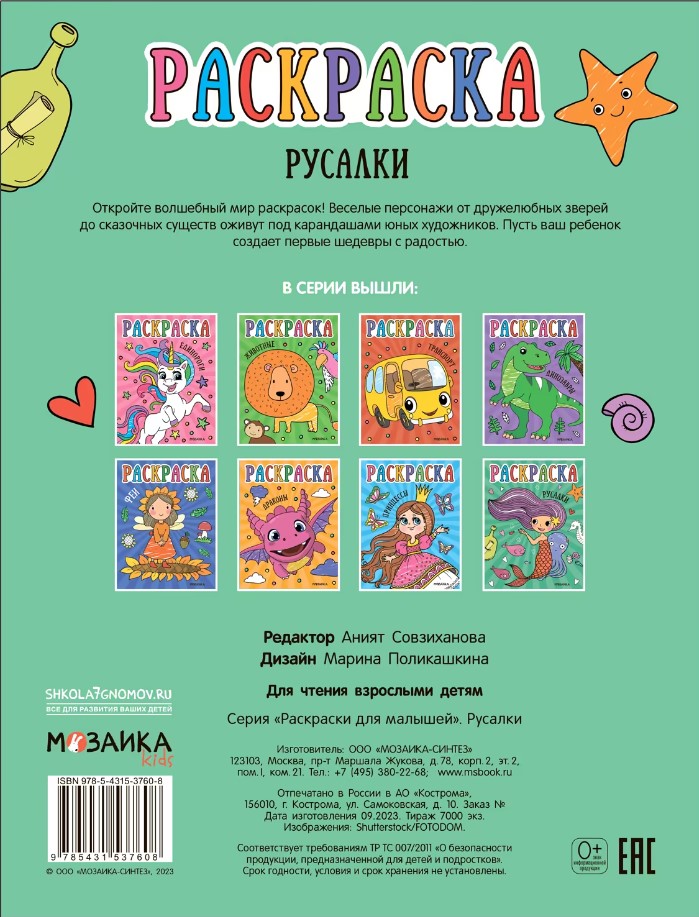Книга «Русалки» серии «Раскраски для малышей» — захватывающее приключение в глубинах океана. На страницах ребенок найдет изящных подводных жительниц и сможет погрузиться в мир фантазий. Эта раскраска не только развлечет ребенка, но и поможет развить концентрацию, творческое мышление и мелкую моторику.