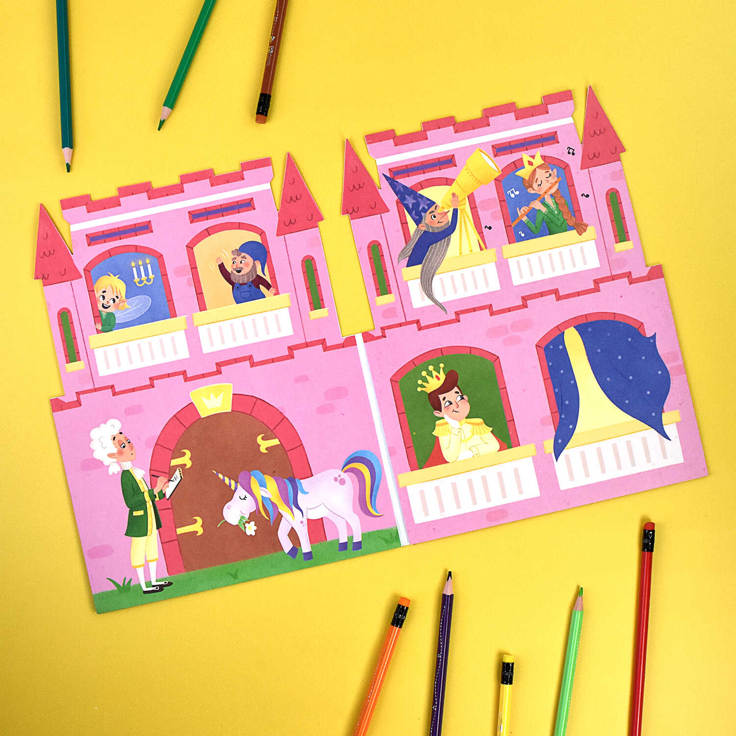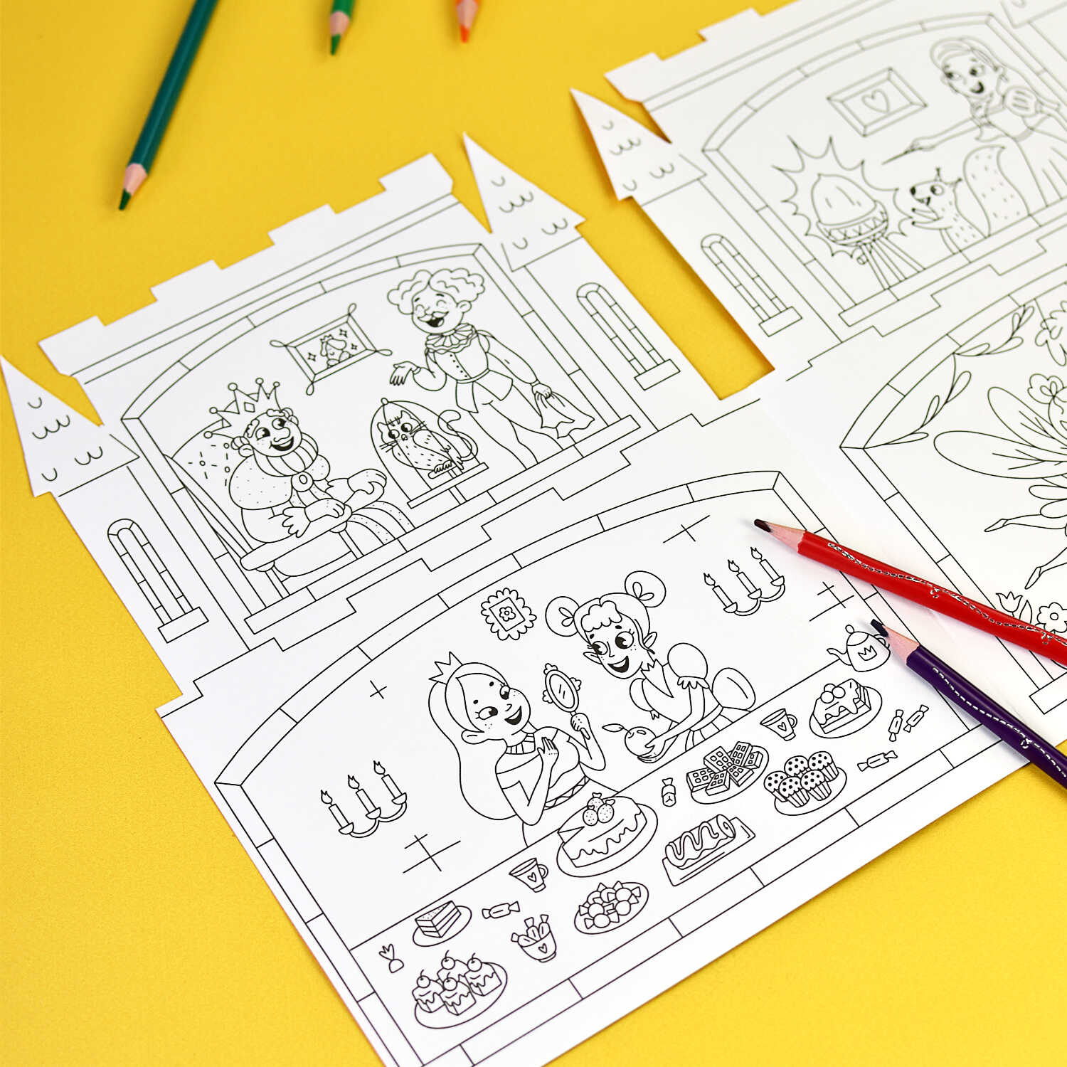 Этот сказочный замок можно не только раскрасить, но и свернуть в 3D-модель. Девочки узнают, чем занимается принцесса, сколько у неё платьев, как проходят вечеринки с гномами. А ещё можно поиграть с объёмным замком на столе или на полу.