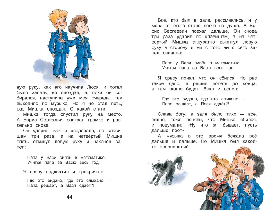 В книгу вошли следующие произведения: В. Голявкин «Как я под партой сидел», «Тетрадки под дождем», «Что Нике делать?», «Козел-баран», «Не везет», «Карусель в голов», В. Драгунский «Синий кинжал», «Смерть шпиона Гадюкина», «Где это видано, где это слыхано», М. Дружинина «Звоните, вам споют!», Л. Каминский «В кабинете директора», «Работа над ошибкам», И. Пивоварова «Сочинение», «Привет с далекого Севера!, А. Раскин «Как папа писал два сочинения», «Как папу дразнили», М. Москвина «Пирамид», И. Ильин «Генеральная уборка», «Что искал Архимед», О. Колпакова «Дуэль наоборот», «Лучшая подруга», С. Георгиев «Любовь без взаимности», «Вечный двигатель».