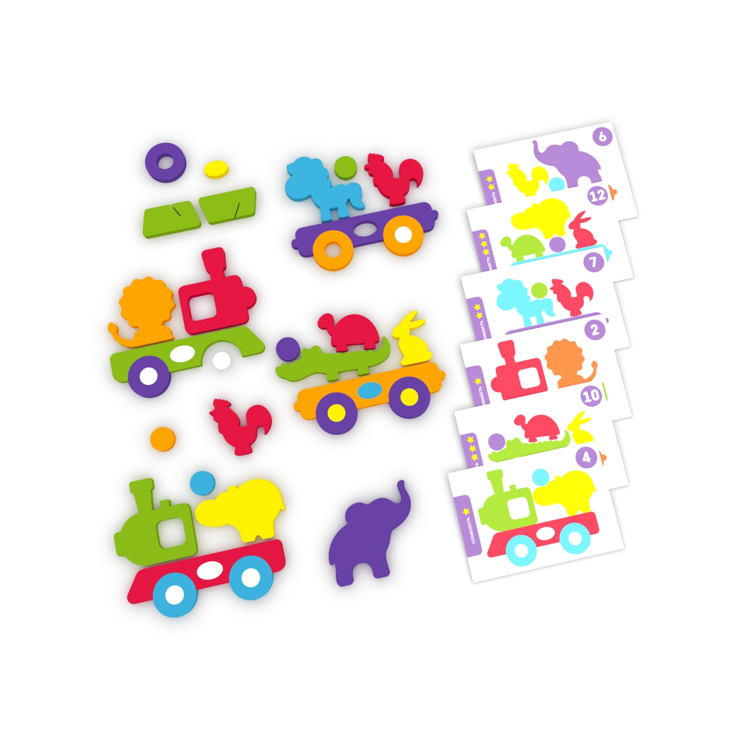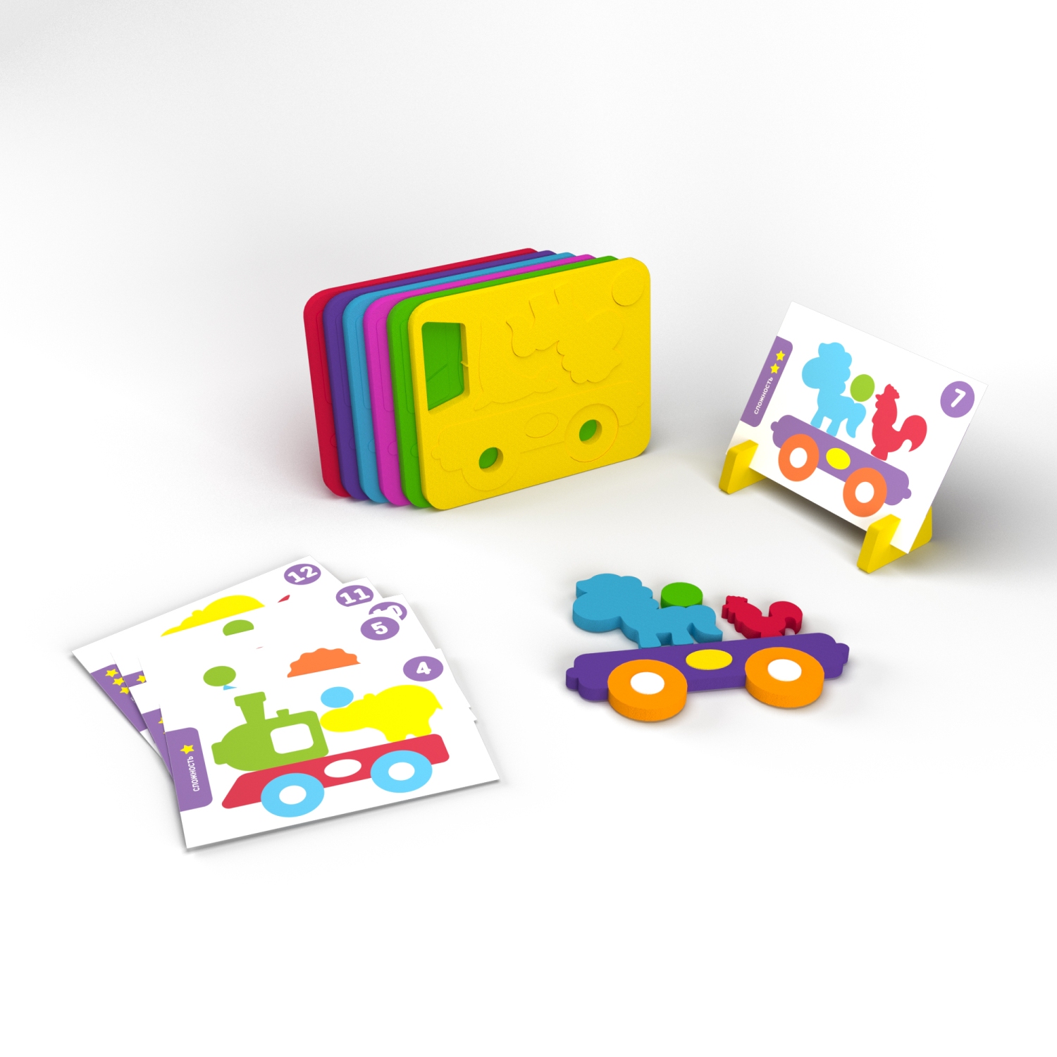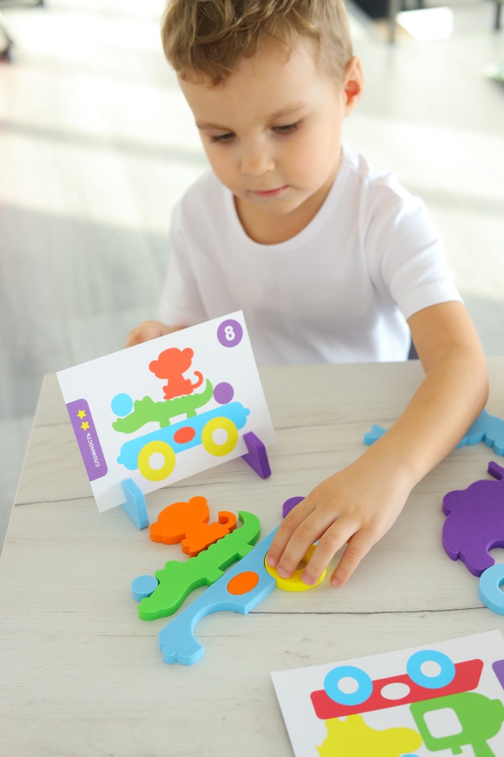 Игра с набором схематических карточек — отличный способ развития малышей дошкольного возраста. Главная задача малыша — найти подходящие элементы и сложить из них животных в точности, как они изображены на карточках с заданиями различного уровня сложности. Изучаем цвета, фигуры, животных, тренируем визуальную память, а также изобретаем новые транспортные средства.
