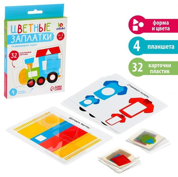 Развивающий набор «Цветные заплатки» поможет потренировать мелкую моторику, логическое мышление и память. В игровой форме ребёнок изучит геометрические фигуры, цвета, а также научится сравнивать предметы и объединять их в группы.