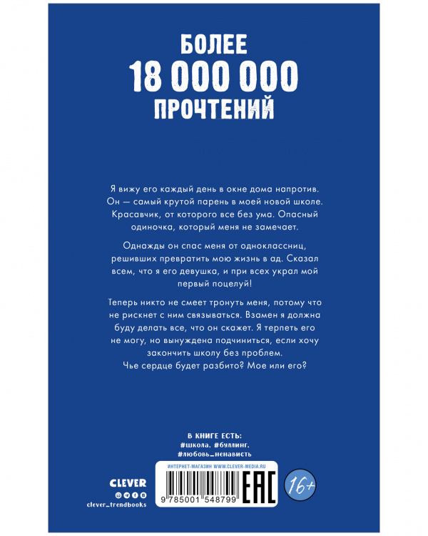 Я вижу его каждый день в окне дома напротив.Он - самый крутой парень в моей новой школе. Красавчик, от которого все без ума. Опасный одиночка, который меня не замечает. Однажды он спас меня от одноклассниц, решивших превратить мою жизнь в ад. Cказал всем, что я его девушка, и при всех украл мой первый поцелуй! Теперь никто не смеет тронуть меня, потому что