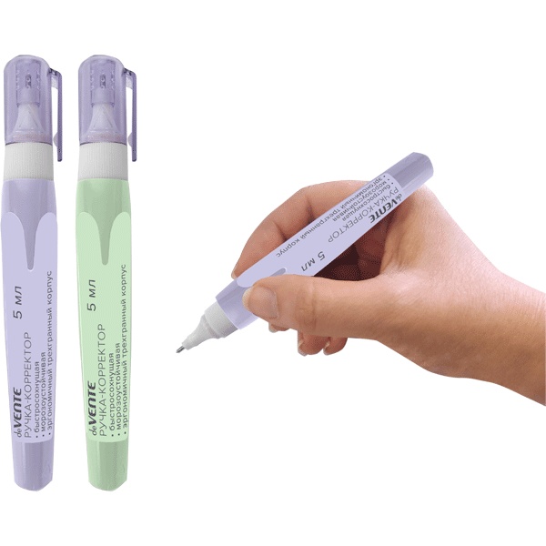 Корректор шариковый «deVENTE» из коллекции Mentality (объёмом 7 мл) - внешне напоминает обычную ручку, только вместо чернил внутри специальная маскирующая белая жидкость. Предназначена для точечных исправлений ошибок на всех типах бумаг. Показывает отличный результат на всех видах и цветах чернил. Трубчатая система подачи, мягкий эргономичный корпус и тонкий металлический шариковый наконечник с регулирующим микроклапаном беспечивают плавное движение, точное аккуратное нанесение и экономичный расход средства. Жидкость на основе растворителя. Очень быстро сохнет (среднее время высыхания 40 сек против 60 сек у стандартной жидкости на водной основе). Морозоустойчивая до -50°C. После размораживания восстанавливает свои свойства. Отлично маскирует локально необходимый фрагмент, создавая непрозрачный слой, незаметный на ксерокопиях. Съёмный тонированный колпачок с клипом защищает рабочий узел от механического повреждения, пыли и загрязнения.