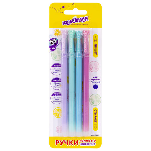 Набор гелевых стираемых ручек ЮНЛАНДИЯ "Лимонад" с удобным прорезиненным корпусом (soft-touch). Ручки пишут специальными гелевыми чернилами, которые становятся невидимыми при нагревании. Нагрев достигается ластиком, встроенным в корпус ручки.