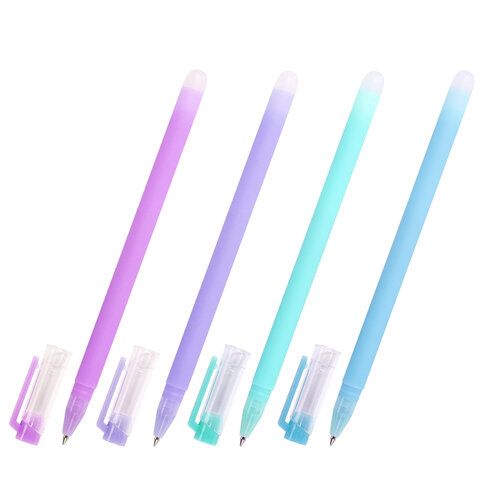 Ручка имеет круглый прорезиненный корпус в цвете ассорти нежных оттенков. Наконечник стандартный. Длина сменного стержня составляет 130 мм. Диаметр пишущего узла, равный 0,5 мм, создает линию письма, равную 0,35 мм. Возможность многократного стирания и повторного письма. Цвет чернил - синий. В наборе 4 ручки.