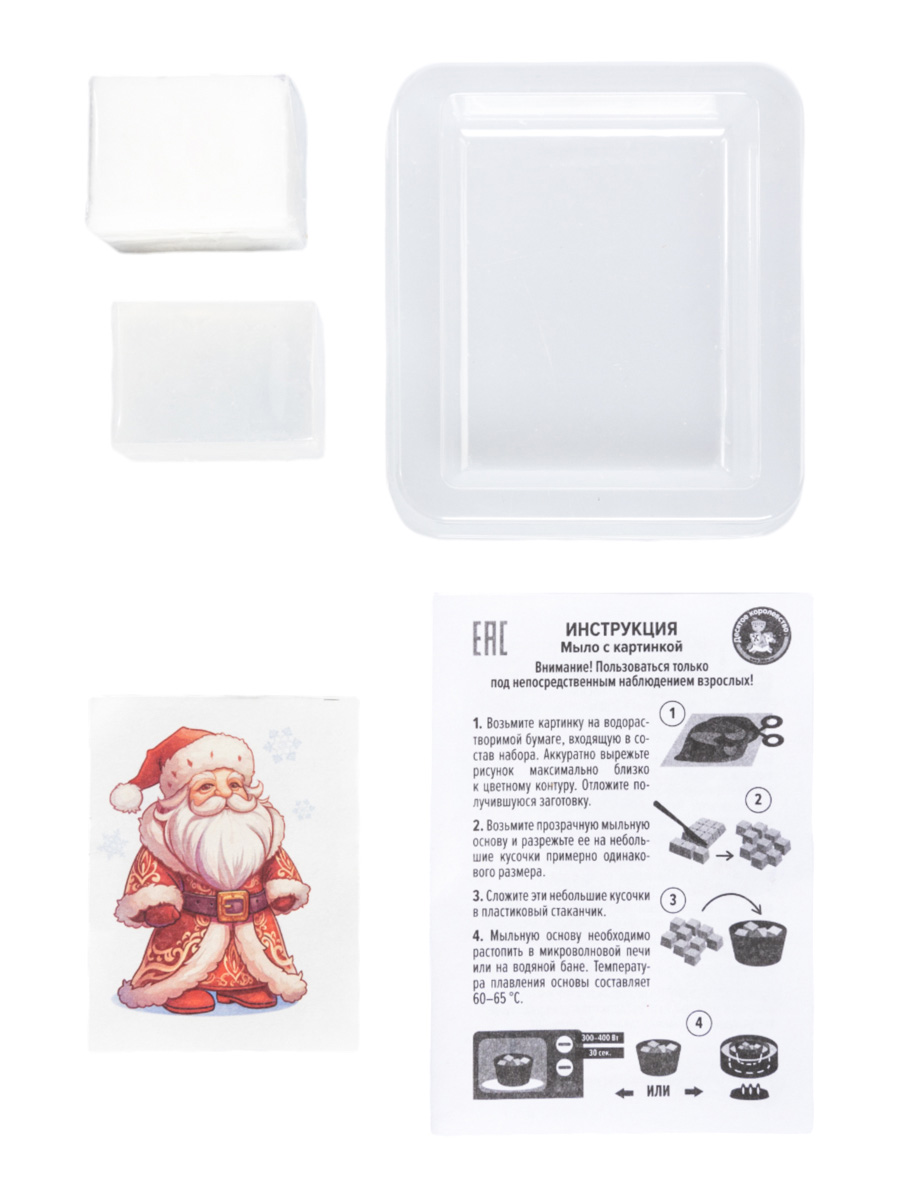 Набор для изготовления мыла «Дед Мороз» с картинкой - один из самых красивых наборов с новогодней картинкой. С его помощью ребенок сделает приятный подарок своим друзьям или близким на Новый год. Для этого потребуется внимание, ответственность и строгое соблюдение инструкции. Единственным ограничением является контроль и помощь со стороны взрослых при нагреве и манипуляциях с горячей мыльной основой.