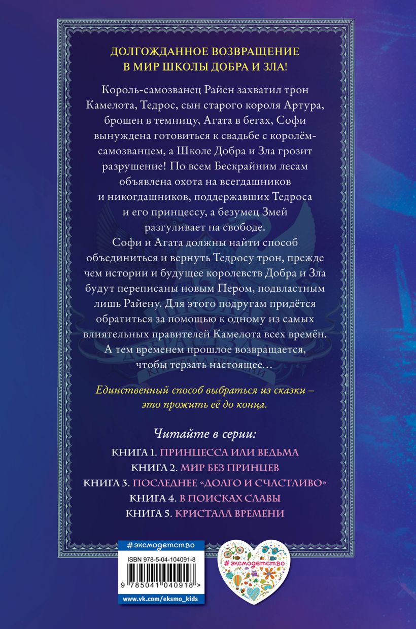 Долгожданное продолжение серии-бестселлера! Школа Добра и Зла возвращается! Трон Камелота захвачен Райеном, королём-самозванцем. Наследник престола Тедрос брошен в темницу, Агата в бегах, а Софи под страхом смерти готовится к свадьбе с Райеном. Ведьмы из комнаты 66, профессор Доуви и Хорт объявлены в розыск по всем Бескрайним лесам как опасные преступники, и их преследует безумец Змей. Софи и Агата должны найти способ объединить свои силы и дать отпор Райену и Змею и возвести на престол Тедроса. Иначе и Добру, и Злу грозит забвение — Райен владеет Пером, которое способно переписать прошлое и будущее, не оставив от привычных нам Бескрайних лесов и следа.