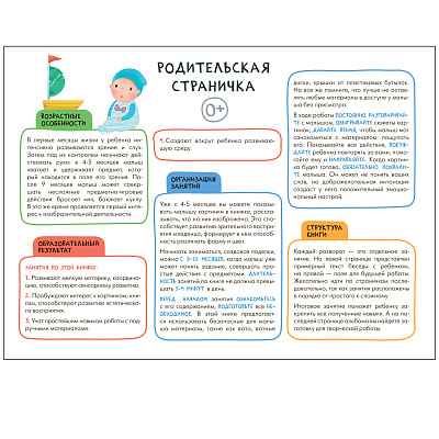 Книга «Декоративное творчество 0+» из серии «Школа Семи Гномов. Мастерская» — это красочный альбом для занятий творчеством с ребенком от рождения до 1 года. Занятия на близкие и понятные ребенку темы расположены по мере усложнения: поступательно переходя от освоения простых навыков к более сложным заданиям, ребенок научится создавать творческую работу из подручных материалов с помощью клея и пластилина.