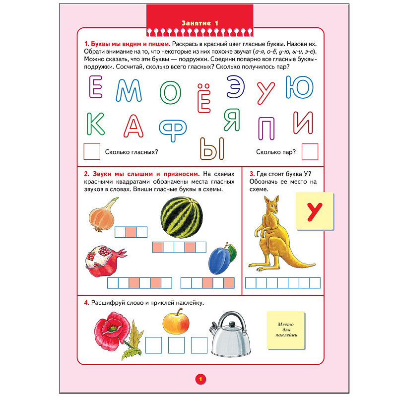 С помощью уроков ребенок повторит все, что было изучено им ранее, он научится различать гласные и согласные, познакомиться со слогами, попробует сложить из них слоги.
