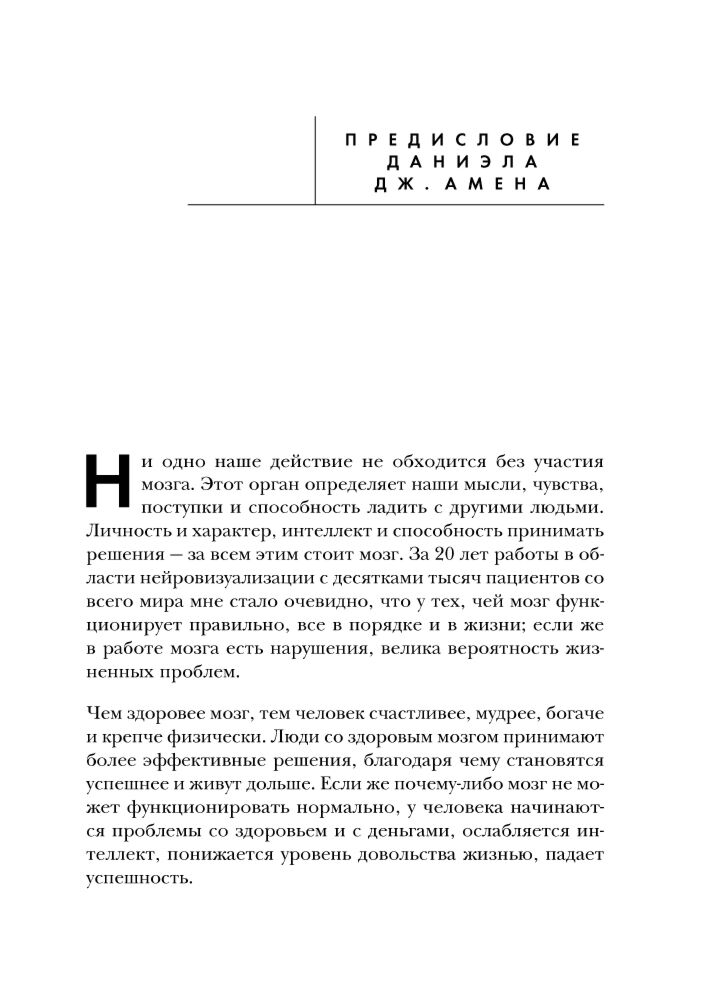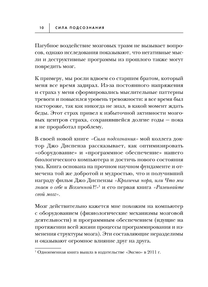 Мозг – это важнейший орган каждого человека. Взаимосвязь мышления, мозга и тела оказывает глубокое влияние на жизнь человека, которое многие недооценивают. В своей книге Доктор Джо Диспенза рассказывает о функциях и возможностях человеческого мозга и о перепрограммировании мышления с помощью научно обоснованных нейрофизиологических методик, основанных на простой, но могущественной истине: наше будущее зависит от наших сегодняшних мыслей. Данное пособие содержит ценные практические указания по развитию мозга, позволяющие читателю совершить жизнеутверждающие перемены в теле, разуме, судьбе, взаимоотношениях.