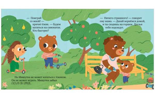Маленький Мишутка обожает играть и веселиться, но иногда перед выходом из дома забывает сходить на горшок. Чтобы на прогулке не случилась лужица, медвежонок учится пользоваться горшком, как взрослый. Ваш малыш вместе с Мишуткой попрощается с подгузником, поймёт, когда нужно сходить в туалет, и не намочит штанишки на прогулке. Милая история с добрым героем станет незаменимым помощником для детей и взрослых и поможет малышу быстро привыкнуть к горшку.