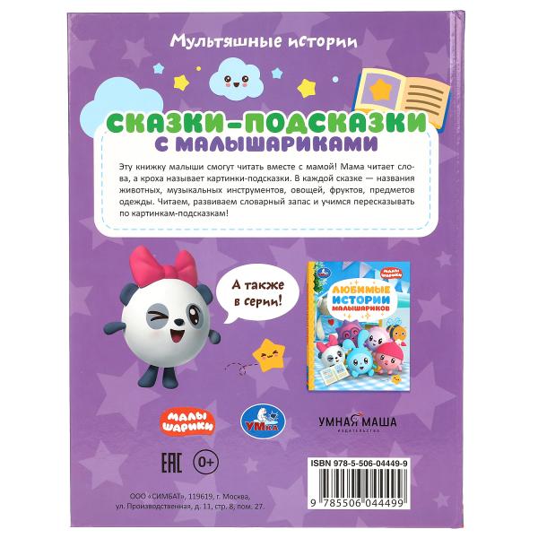 Книга с крупными буквами «Сказки-подсказки с Малышариками» непременно понравится маленькому поклоннику мультсериала «Малышарики»:
