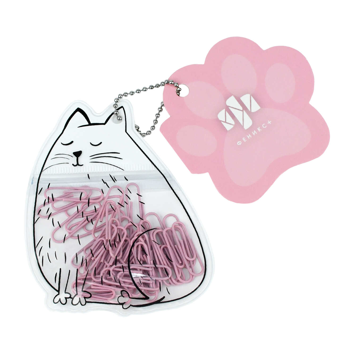 Скрепки канцелярские, арт. 71495 / 48 БЕЛЫЙ КОТИК (40 шт. в наборе, размер: 28 мм, материал: металл, ПВХ; цвет: розовый; особенности: ПВХ-оплётка; индивидуальная упаковка: ПВХ-пакет с многоразовой струнной застёжкой (зип-лок) + металлический подвес (мулька))