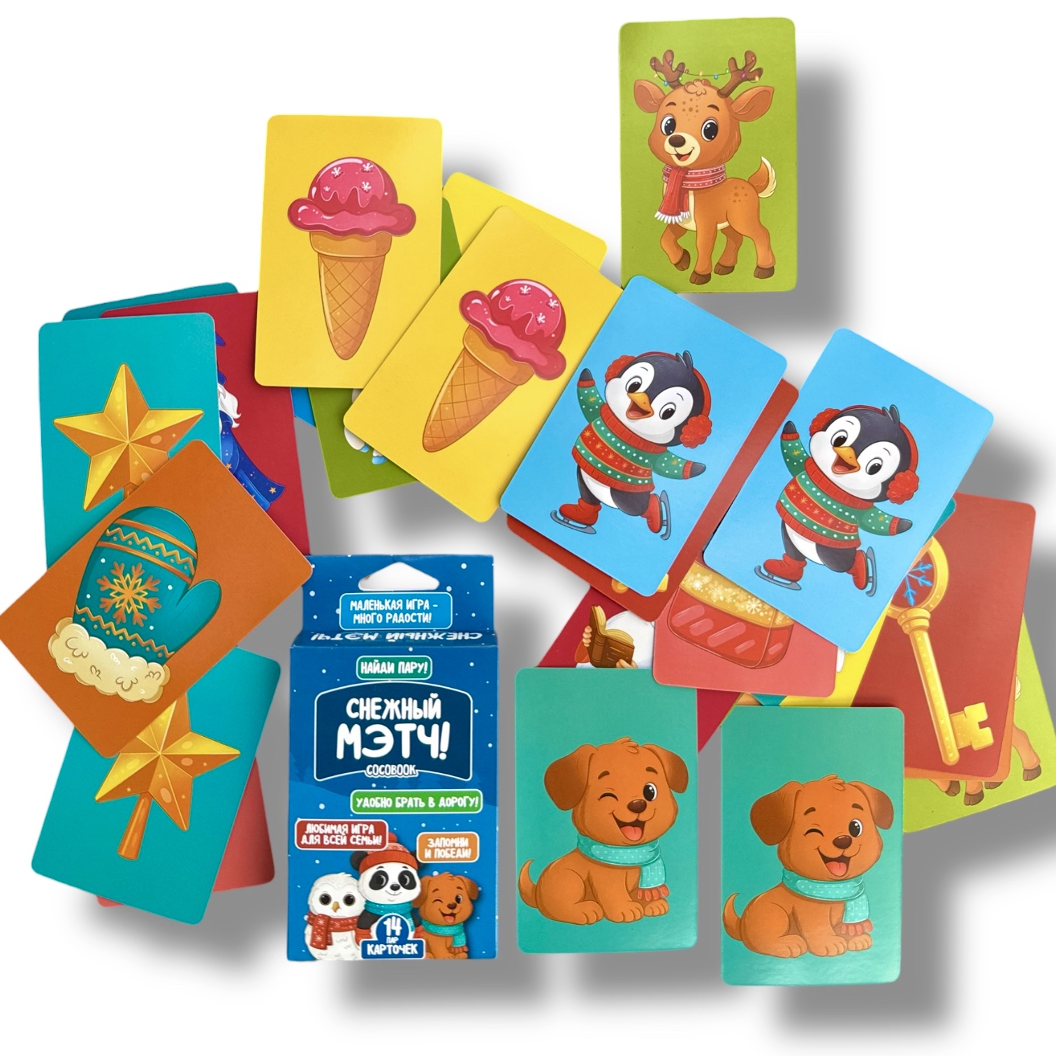 Весёлое приключение для всей семьи! Игра «Снежный МЭТЧ!» развивает внимание, память и реакцию, предлагая найти пары зимних картинок среди 28 ярких карточек.