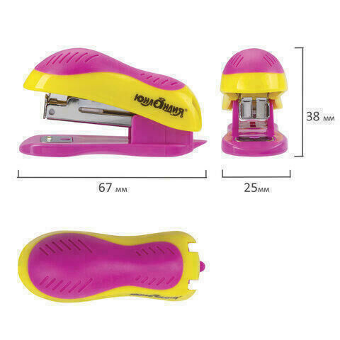 Степлер №10 МИНИ до 15 листов, с антистеплером, эргономичный, желто-розовый, 228491