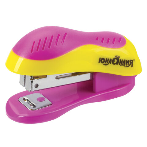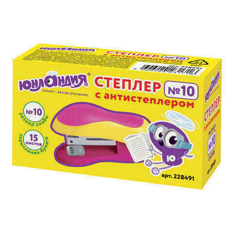 Для скрепления до 15 листов. Размер скоб №10. Глубина закладки бумаги — 25 мм. Закрытый вид сшивания. Эргономичная форма корпуса обеспечивает продолжительное время использования без перерыва. Данная модель может выступать в качестве антистеплера, позволяющего разжать закрепленные скобы более качественно, не нанося повреждений ни материалу, ни кончикам пальцев. За счет компактных размеров не займет на парте или столе много места, а сочетание желтого с розовым цветом добавят яркости во время уроков или написания домашней работы.