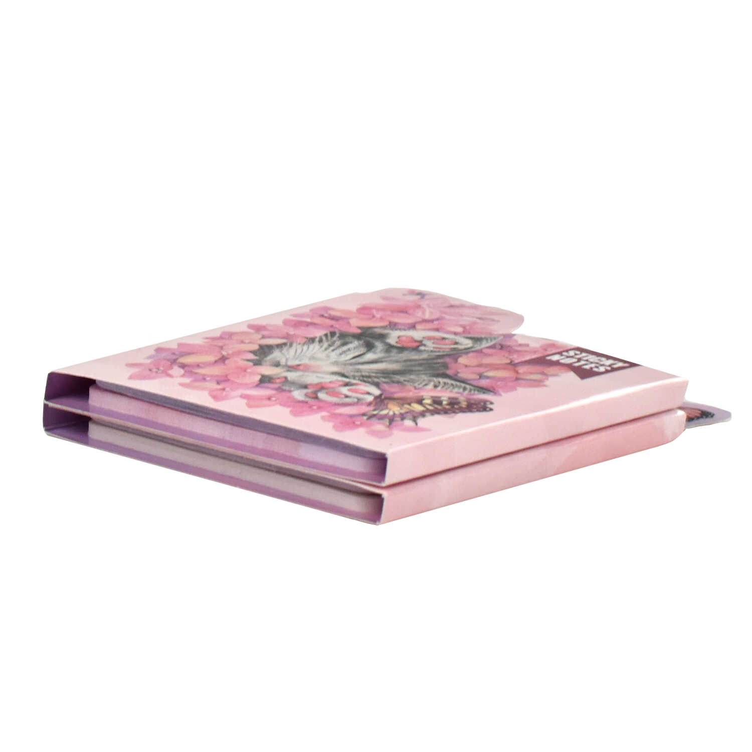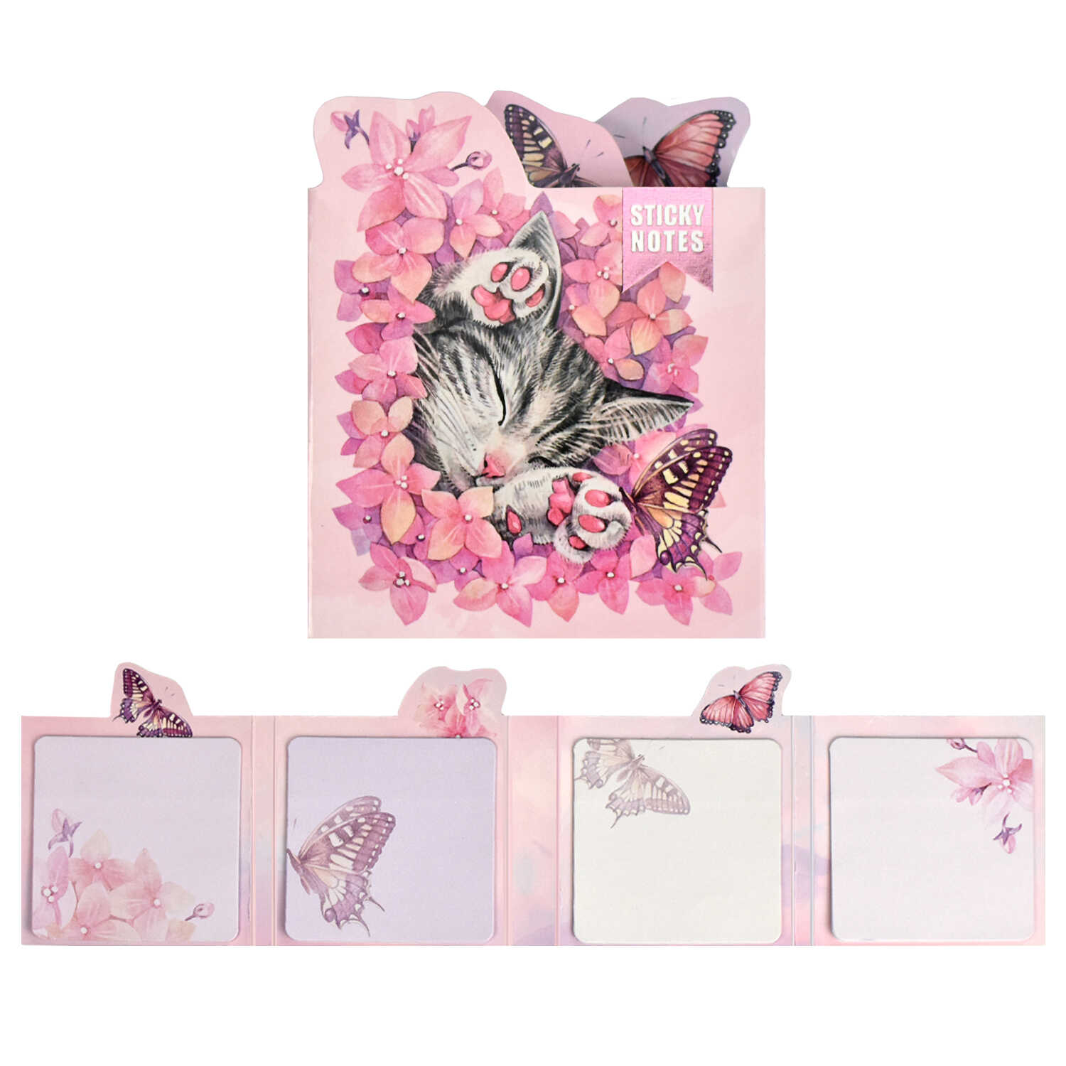 Стикеры для заметок бумажные, 75x75 мм, 100 шт., арт. 65156 / 25 КОТ (материал: дизайнерская бумага 80 г/м², цвет: жёлтый, розовый, сиреневый; кол-во цветов: 4, кол-во каждого цвета: 25, форма: квадратная, декор: полноцветная печать, тиснение фольгой; наличие диспенсера: нет, особенности: книжка-подложка с фигурным краем из мелованного картона; индивидуальная упаковка: ПЭТ-пакет с европодвесом)