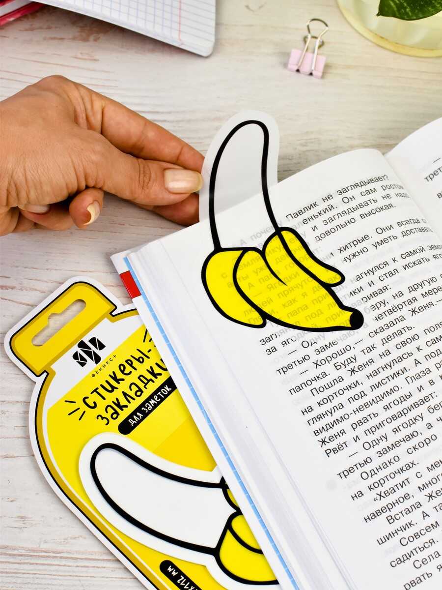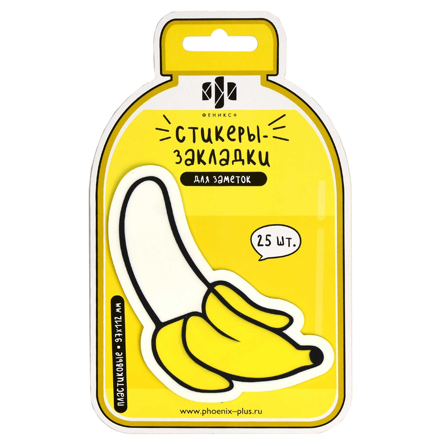 Стикеры-закладки пластиковые, 97х112 мм, 25 шт., арт. 65191 / 48 БАНАН (материал: пластик цвет: жёлтый; кол-во цветов: 1, кол-во каждого цвета: 25, форма: фигурная, декор: полноцветная печать; наличие диспенсера: нет, индивидуальная упаковка: подложка с европодвесом из мелованного картона + ПЭТ-пакет)