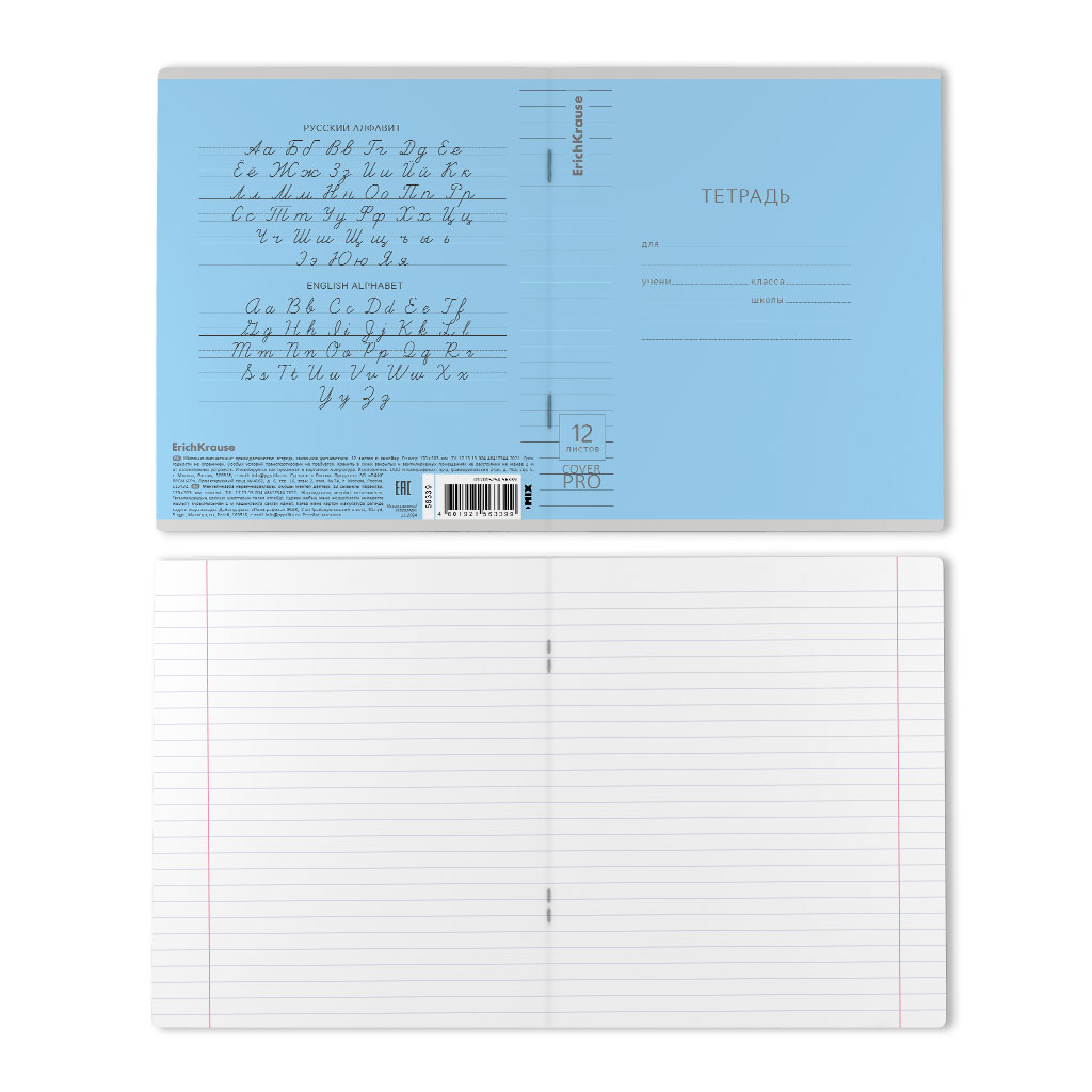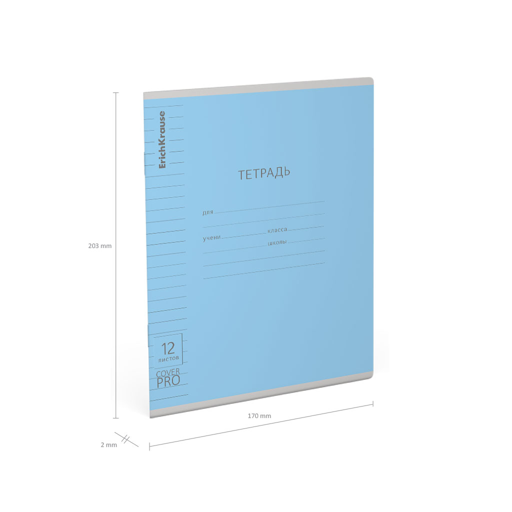 Тетрадь школьная ученическая формата А5+ (170x203 мм). Двойная обложка: внешняя выполнена из высококачественного износостойкого прозрачного пластика с фактурой «апельсиновая корка», внутренняя — из качественной мелованной бумаги. В блоке 12 листов в линейку. Бумага офсетная плотностью 60 г/м2. Цвет линовки — синий. Скругленные уголки обложки и блока. Тип скрепления — скоба. Тетради разных дизайнов упакованы в термоусадочную пленку по 10 штук.