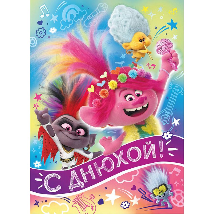 Получить поздравления на День рождения от Розочки мечтает каждая поклонница мультфильмов о приключениях троллей. Порадовать открыткой с любимыми героями теперь просто. Trolls-открытка порадует и мальчика и девочку. Качественная печать делает открытку ярким акцентом праздничного дня. Любимые тролли на открытке приведут в восторг всех фанаток и открытка займет почетное место на столе именинницы. Всё, что нужно - это написать добрые слова-пожелания получательнице и подарок готов! Открытка-подарок подойдёт сестре, подруге, дочери или коллеге.