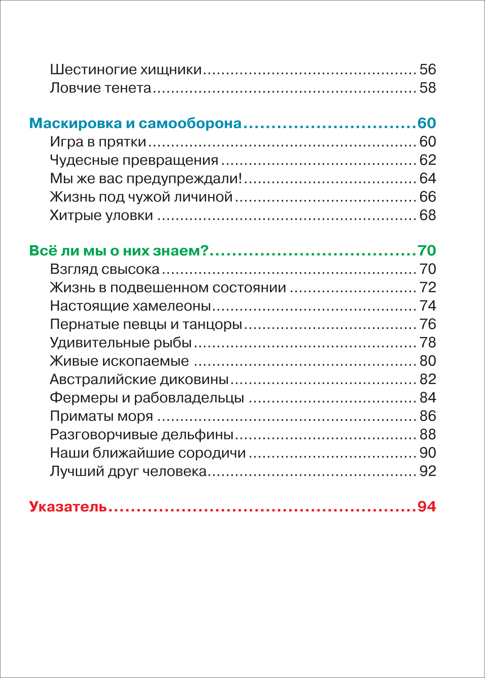 Книга рассказывает о самых разных видах животных, обитающих на Земле. Юные читатели узнают любопытные факты из жизни млекопитающих, птиц, насекомых, рептилий, амфибий, морских обитателей планеты, изложенные увлекательным языком. Крошечные и огромные, хищные и травоядные, опасные и безобидные, дикие и домашние - животные такие разные, но именно поэтому они и интересны нам.