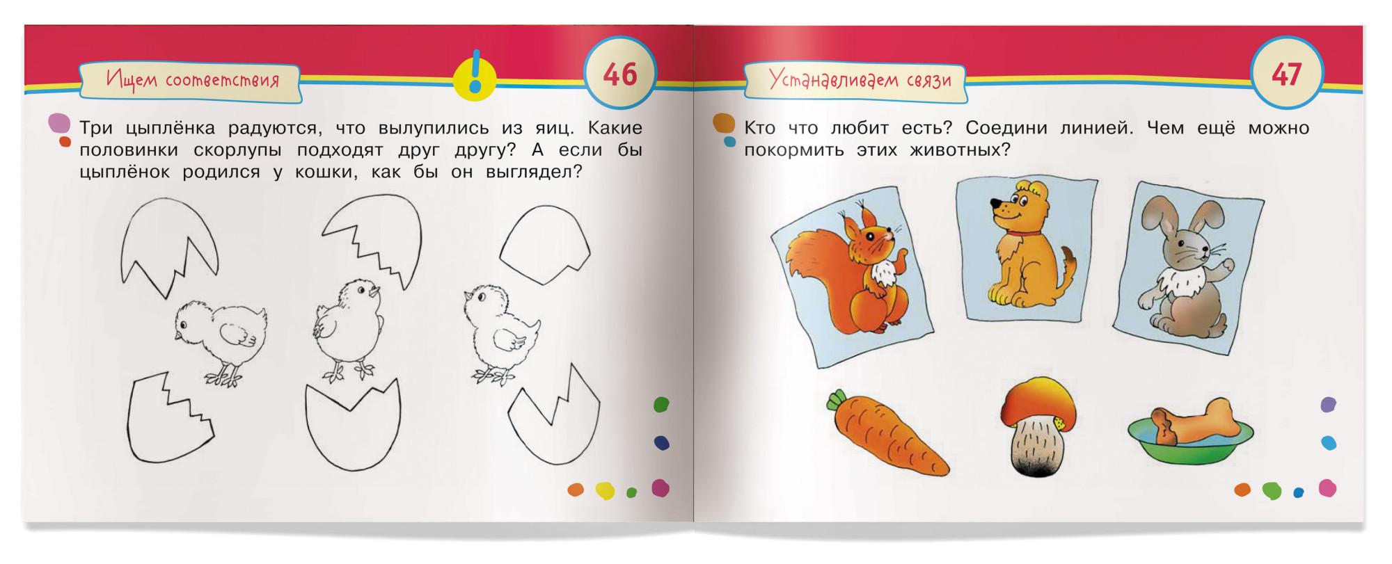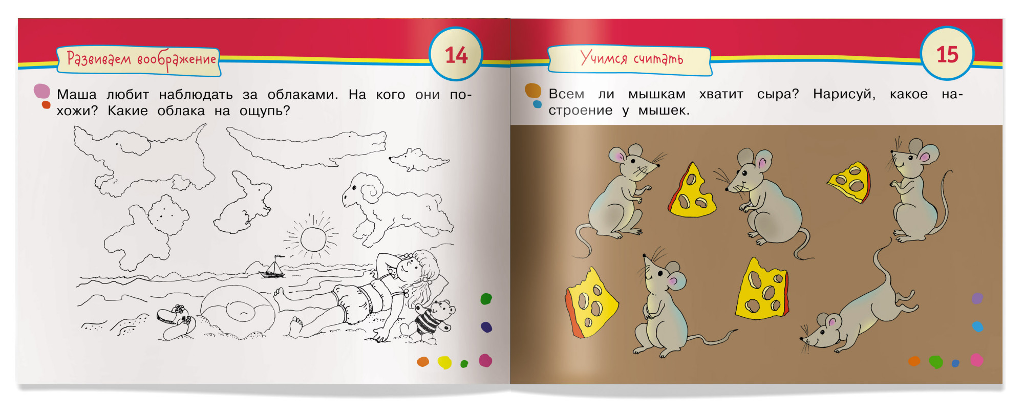 Вместе с героями Мишей и Машей ребёнок будет рисовать по точкам, выдумывать фантастических животных и придумывать имена котятам. Искать отличия и сочинять свои рассказы по картинкам.