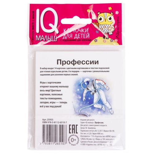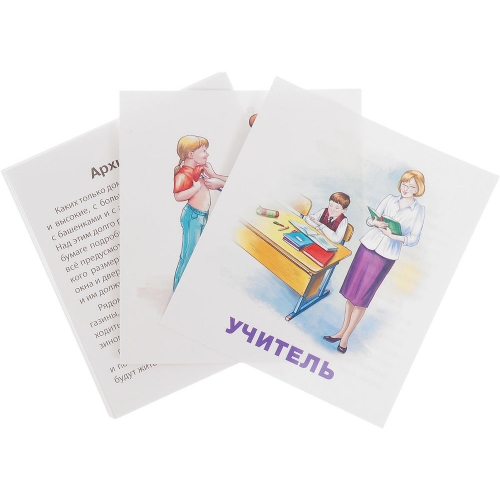 В наборе: врач, космонавт, художник, пожарный, моряк, летчик, полицейский, портной, продавец, повар, пекарь, фермер, архитектор, учитель + 3 карточки с заданиями.