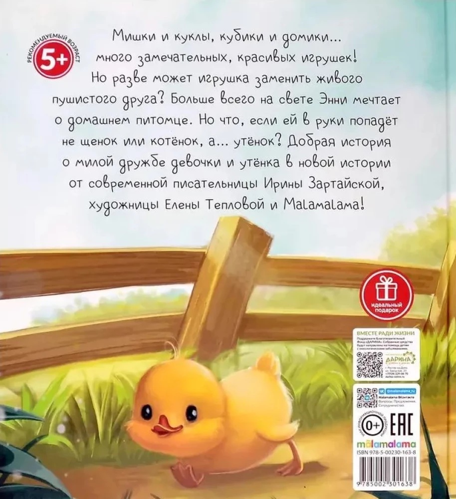 В серии «Уютные книжки» мы собрали для вас добрые сказки современных писателей, которые будет интересно читать и детям и взрослым. Сказка «Энни и утёнок» детской писательницы Ирины Зартайской рассказывает о маленькой девочке, которая очень мечтала завести домашнего питомца. Трогательный сюжет и красочные иллюстрации подарят вам и вашему малышу незабываемые эмоции и создадут чудесную атмосферу, стоит только открыть книжку. Проведите вечер уютно вместе с Malamalama!