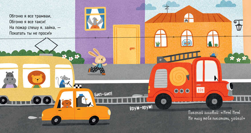 Динамичный сюжет и короткие четверостишия, где на каждой страничке есть небольшие задания на звукоподражание, точно понравятся малышу. Именно поэтому книгу можно предложить в качестве игрушки. Рассматривайте вместе картинки, комментируйте их, произносите звуки, изображенные на картинках. Играйте, веселитесь, запоминайте стихи.