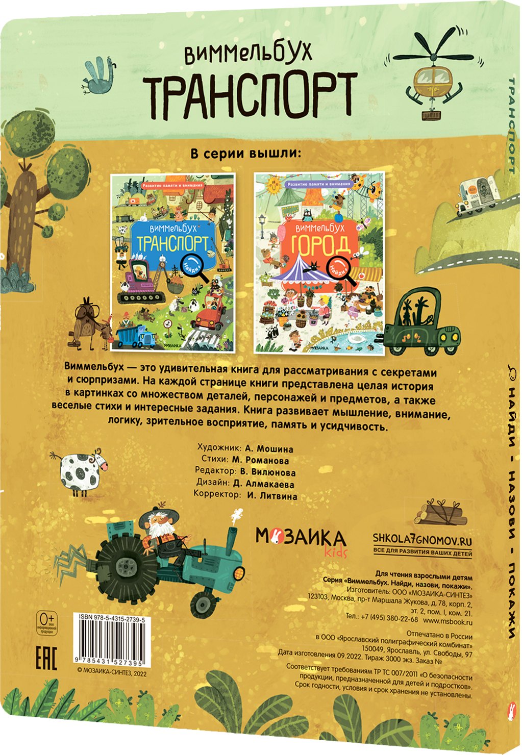 Транспорт (Виммельбух. Найди, назови, покажи) Виммельбух «Транспорт» — это книга для рассматривания с красочными забавными иллюстрациями, секретами и сюрпризами. На каждой странице представлена целая история в картинках со множеством интересных деталей, персонажей и предметов, а также веселые стихи и задания на поиск фрагментов картинки. Ребенок познакомится с разнообразным транспортом: пассажирским, водным, сельскохозяйственным, грузовым, воздушным. Книгу можно рассматривать бесконечно — и находить что-то новое и неожиданное. Книга развивает ...