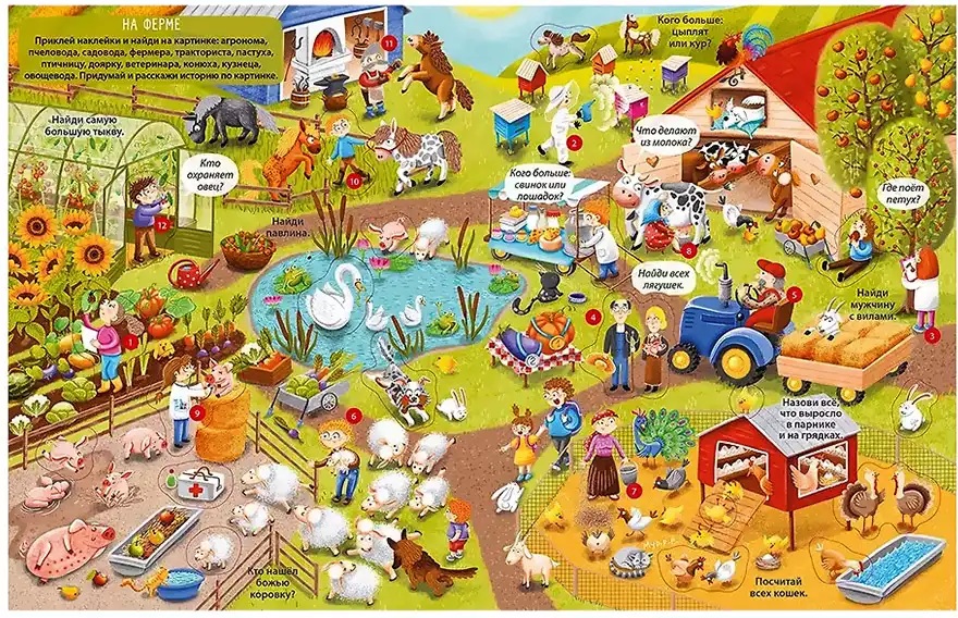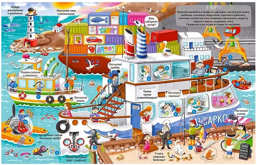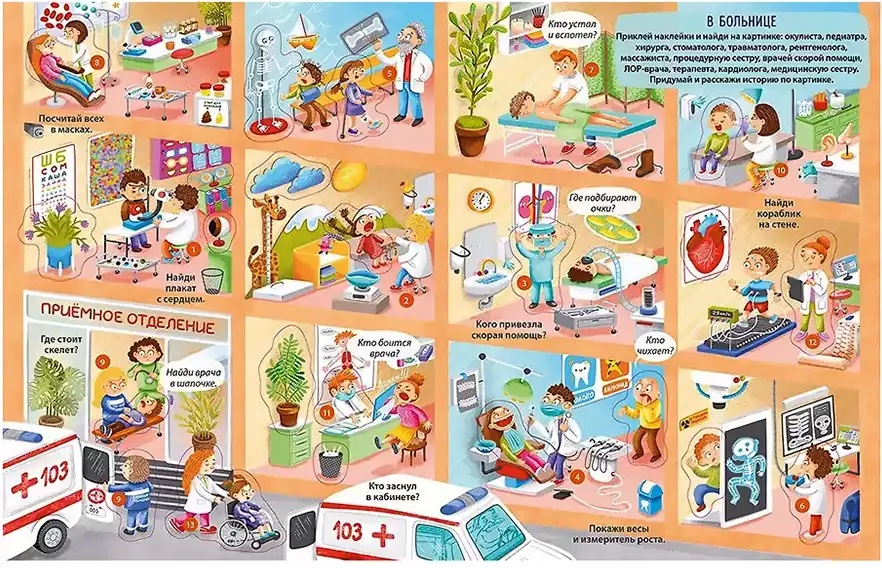Вы держите в руках не просто книгу, а настоящий виммельбух с наклейками. Благодаря ярким иллюстрациям и занимательным заданиям эта книга надолго увлечёт вашего ребёнка и не даст ему скучать ни минуты. Ребёнок узнает о более 150 самых важных, нужных и популярных профессиях. Для удобства изучения все профессии на разворотах пронумерованы, а в начале книги есть полный список с их названиями. Что внутри: 13 фонов с более 150 самых важных, нужных и популярных профессиями: в городе и на ферме, на стройке и в порту, в детском саду и в больнице, в торговом центре и в аэропорту и т.д.; более 280 наклеек; множество заданий на самые важные темы, в том числе на формирование эмоционального интеллекта. Благодаря занятиям по этой книге ребёнок разовьёт основные навыки: внимание; воображение; мелкую моторику; креативность; смекалку; логику.