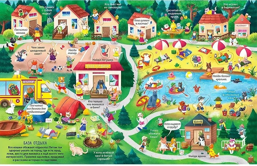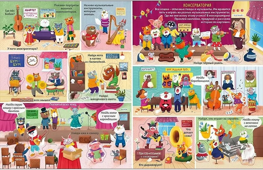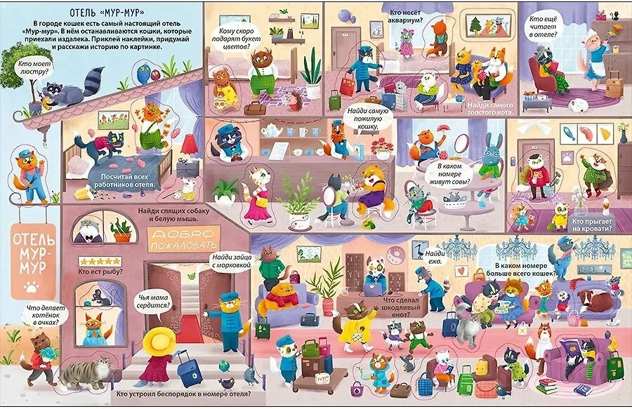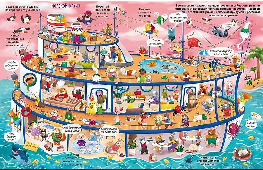 Вы держите в руках не просто книгу, а настоящий виммельбух с наклейками. Благодаря ярким иллюстрациям и занимательным заданиям эта книга надолго увлечёт вашего ребёнка и не даст ему скучать ни минуты. Ребёнок познакомится с милыми и забавными кошками и их: породами, весёлыми историями и приключениям, разными характерами и поведением, сходством с людьми и непохожестью на них и многим другим. В книге более 300 наклеек и множество заданий, в том числе для формирования эмоционального интеллекта.