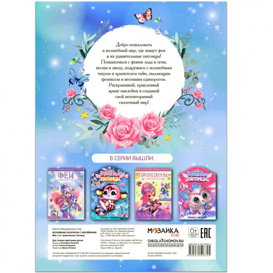 В книге «Феи и их удивительные питомцы» серии «Волшебные раскраски с наклейками» ребенок будет увлеченно раскрашивать новых героев, включая фантазию и воображение, и приклеивать яркие наклейки на страницы книги, делая сказочный мир уютнее и наряднее. За такими занятиями ребенок проведет время не только интересно, но и с пользой: развивая мелкую моторику, внимание и воображение.