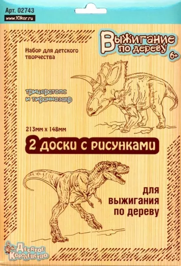 Мир динозавров всегда притягивает к себе внимание. Поэтому в "Десятом королевстве" создали отдельный набор дощечек с рисунками для выжигания и назвали его "Трицератопс и Тираннозавр". Этот набор предназначен для детей старше 6 лет, уже освоивших технику выжигания.