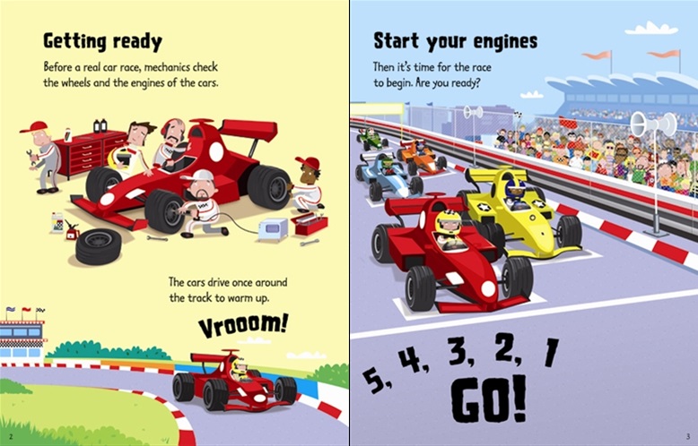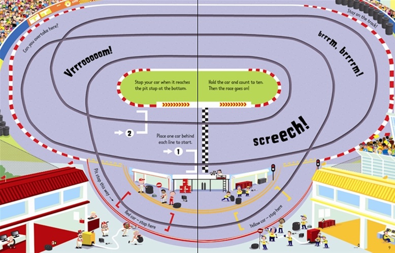 An action-packed book with two wind-up model racing cars to race against each other on the tracks embedded in the thick card pages. With fun facts about racing cars and pit stops and the world of racing.